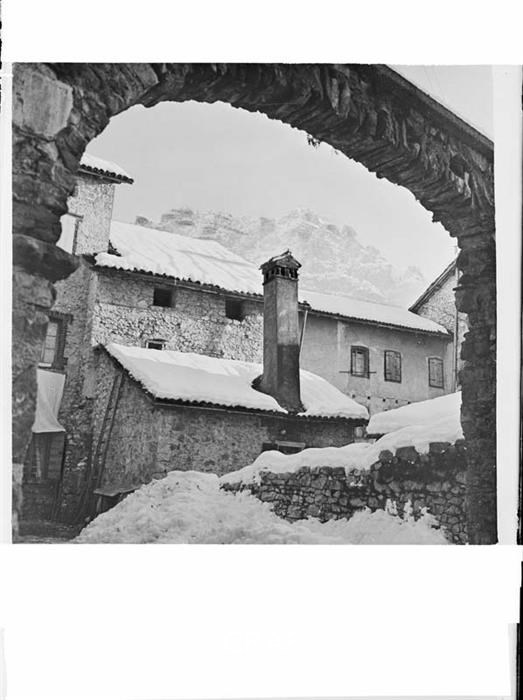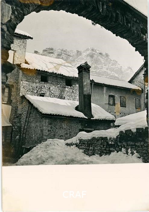 Riproduzione di uno scorcio del borgo di Cimolais coperto di neve, sopra il...