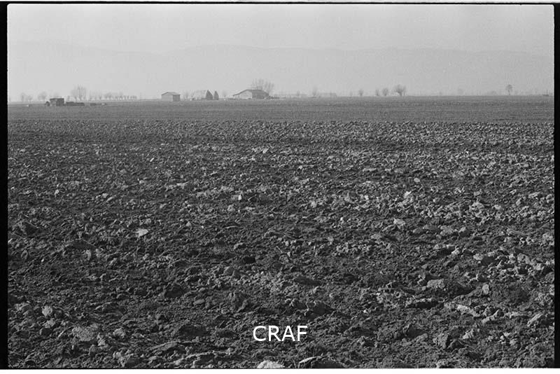 Veduta di una lunga distesa di campi arati nella Piana del Fucino in Abruzzo.