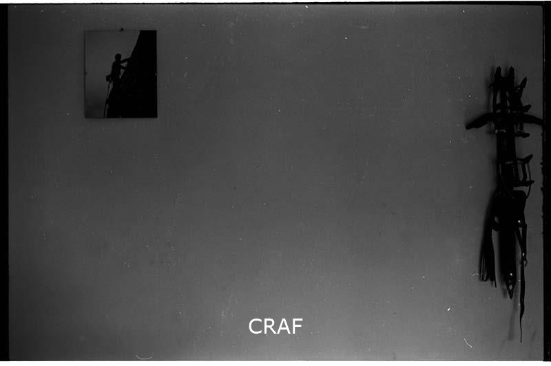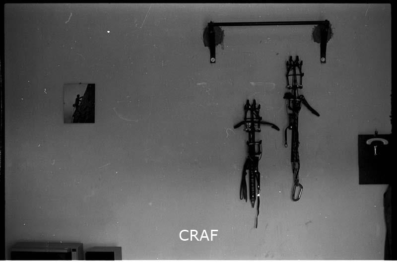 Particolare di una parete in un interno. Sul muro sono appesi un rampone da...