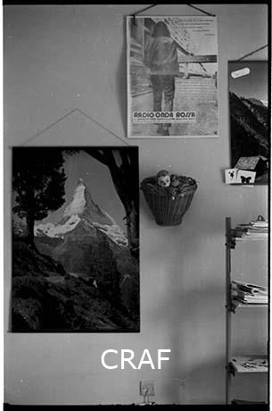 Particolare di una parete in un interno. Sul muro sono appesi alcuni poster,...