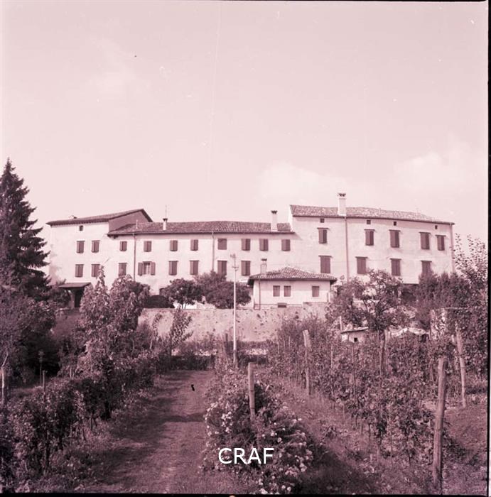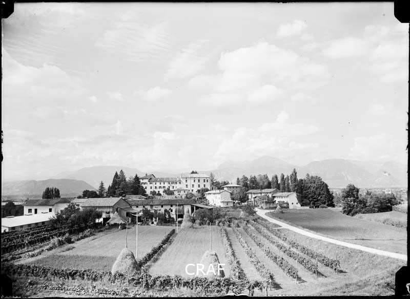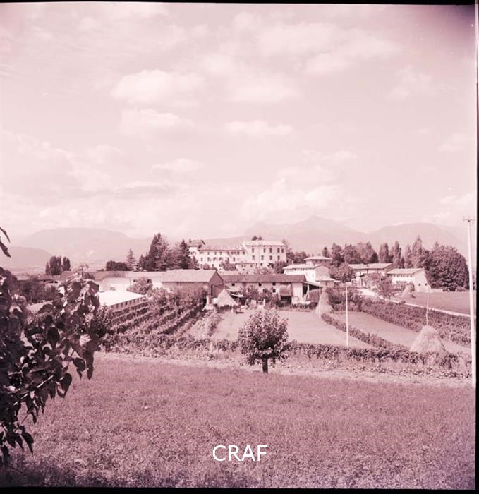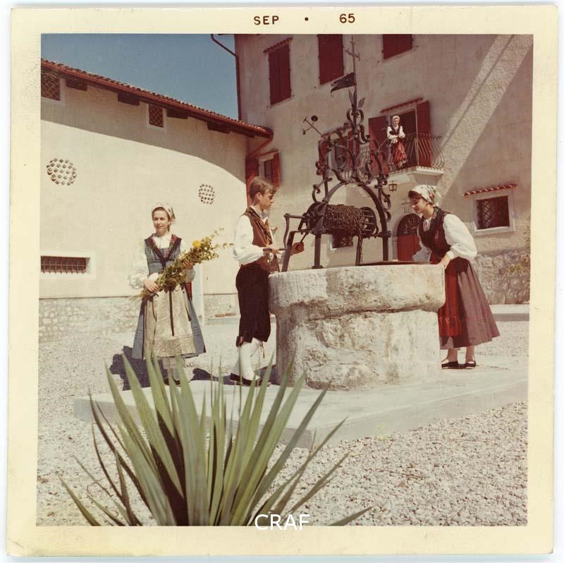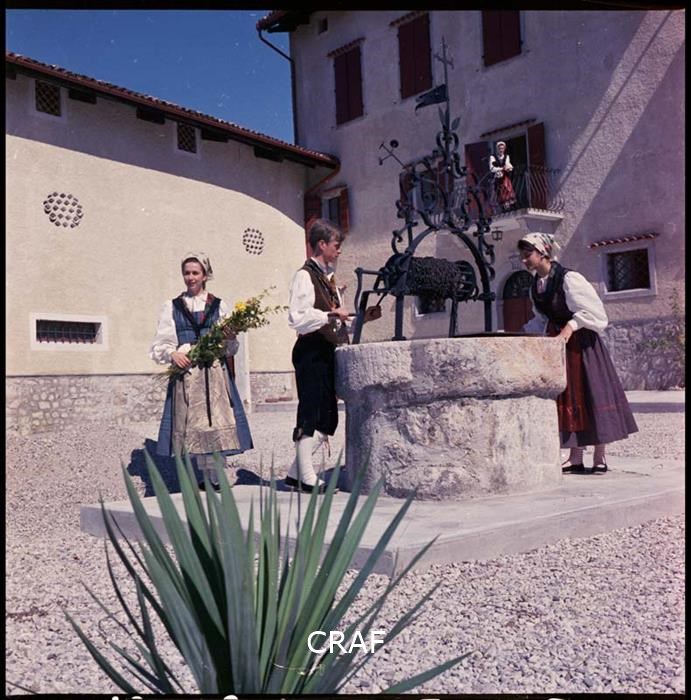 Alcuni ragazzi posano in costume tipico friulano vicino ad un pozzo, nel...
