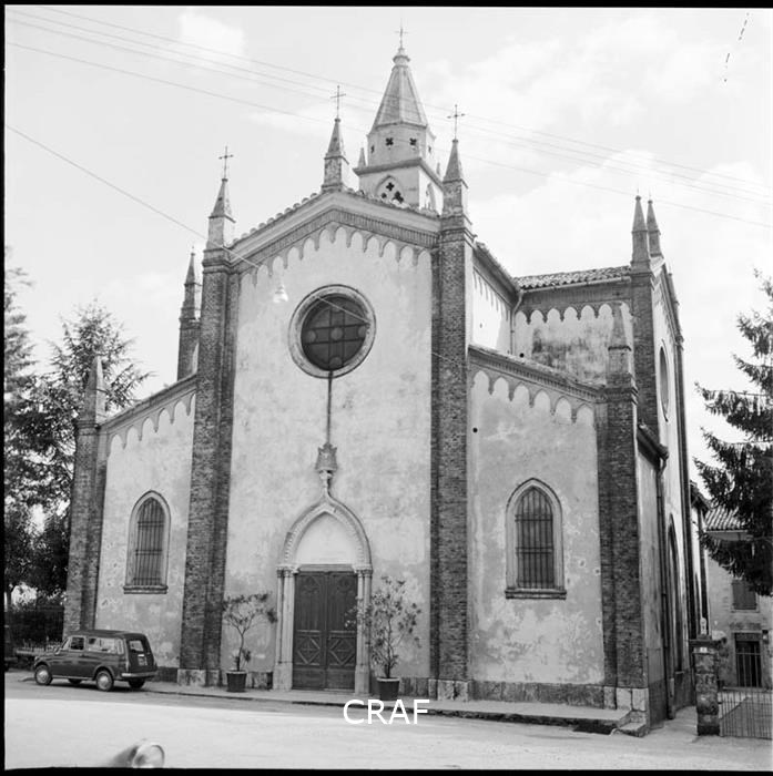 Veduta della chiesa parrocchiale di San Lorenzo Martire. A sinistra la Fiat 500...