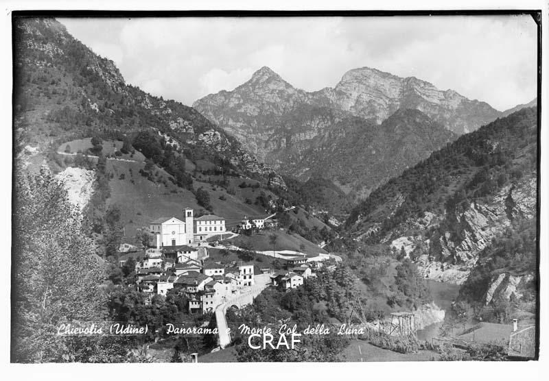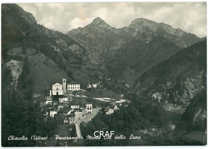 Panorama di Chievolis ripreso in quota con il monte Col della Luna sullo sfondo.