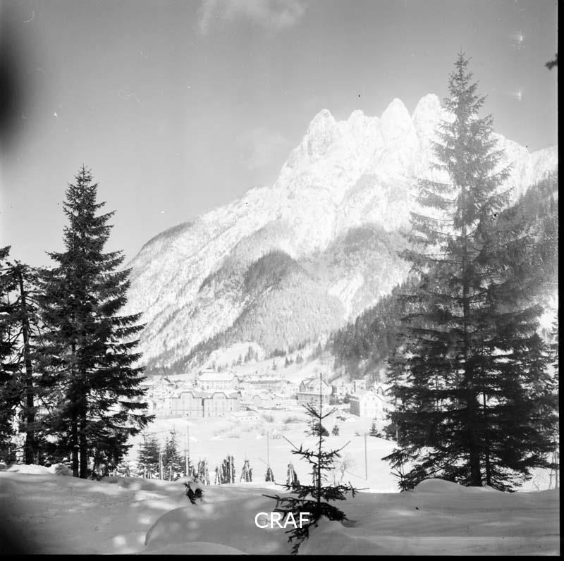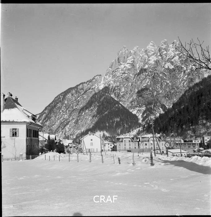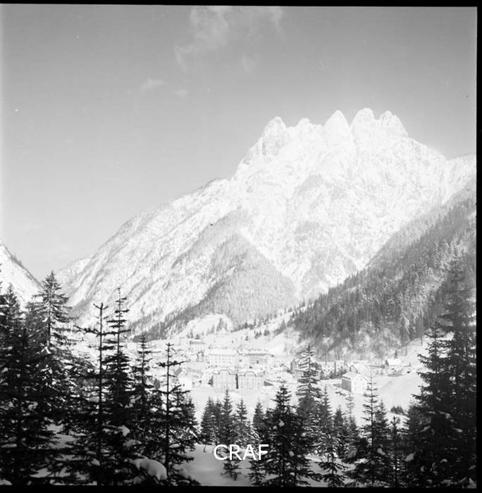 Veduta invernale di Cave del Predil con la cima delle Cinque Punte che sovrasta...
