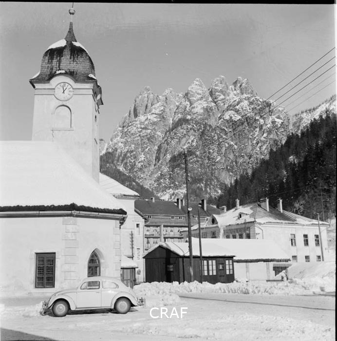 Panorama invernale di Cave del Predil con la Chiesa di Sant'Anna a sinistra e...