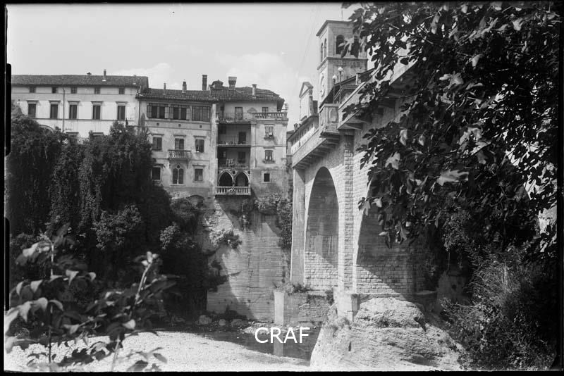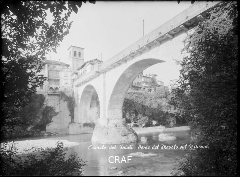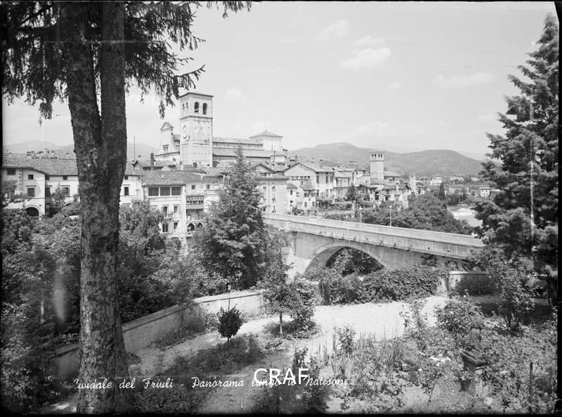 Panorama di Cividale dalla riva del Natisone con scorcio del ponte del Diavolo.