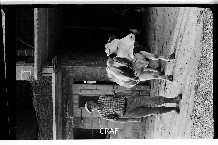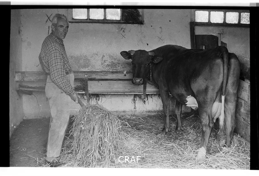 Ritratto di Toni Petracco al lavoro nella sua stalla mentre, con la forca,...