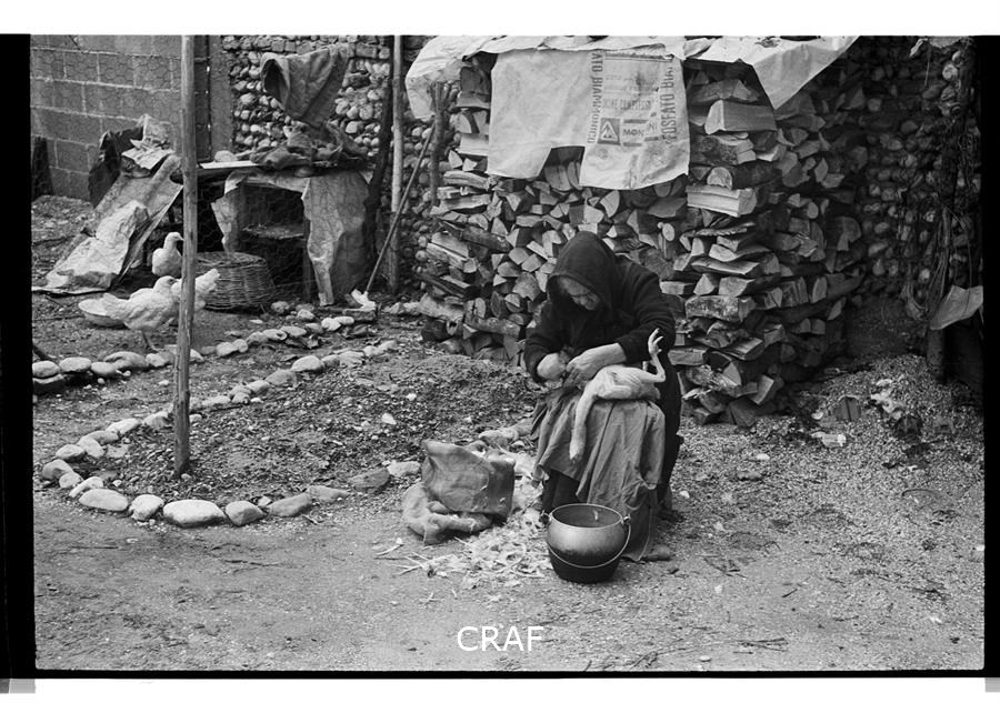 Donna anziana, seduta su una seggiola in mezzo al cortile, dietro a lei la...