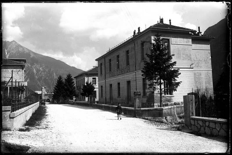 Un bambino cammina davanti al palazzo delle scuole elementari di Amaro; in...