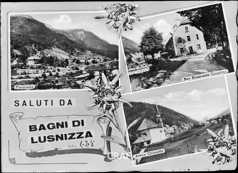 Fotocomposizione con didascalia e tre immagini di Bagni di Lusnizza posizionate...