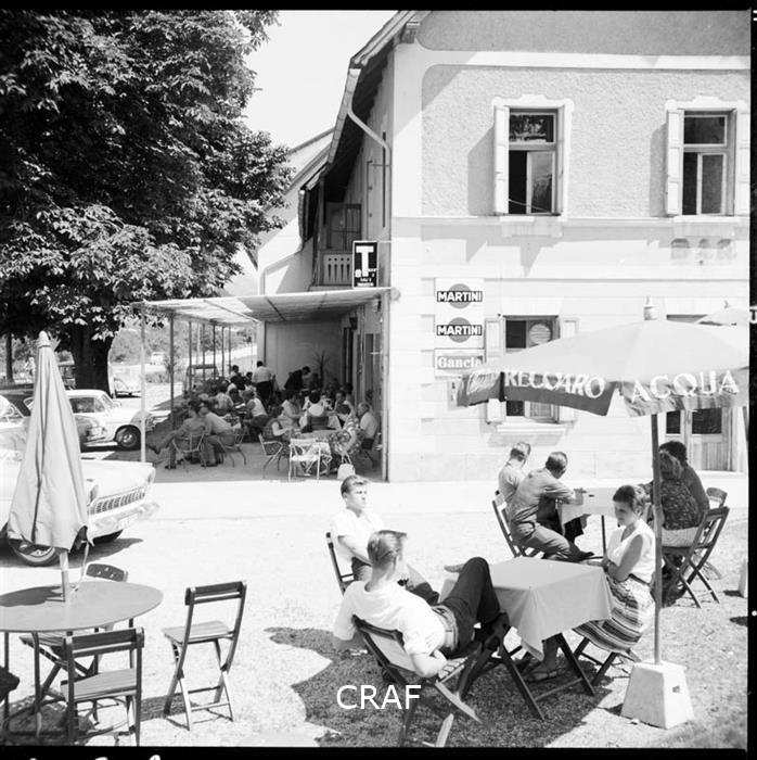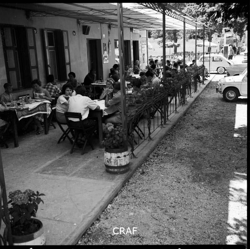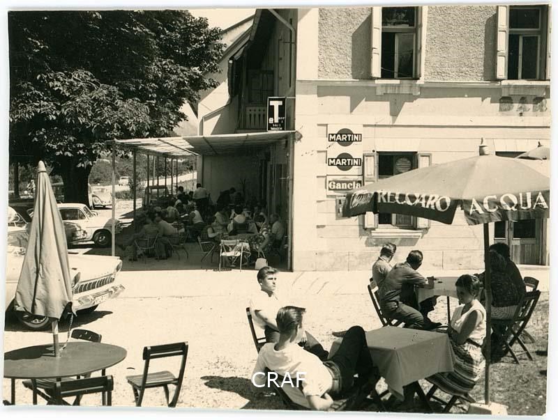 Dettaglio della terrazza del bar ristorante Cavallino affollata di avventori in...