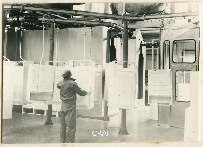 Veduta interna dello stabilimento Zanussi: reparto verniciatura. Un operaio...