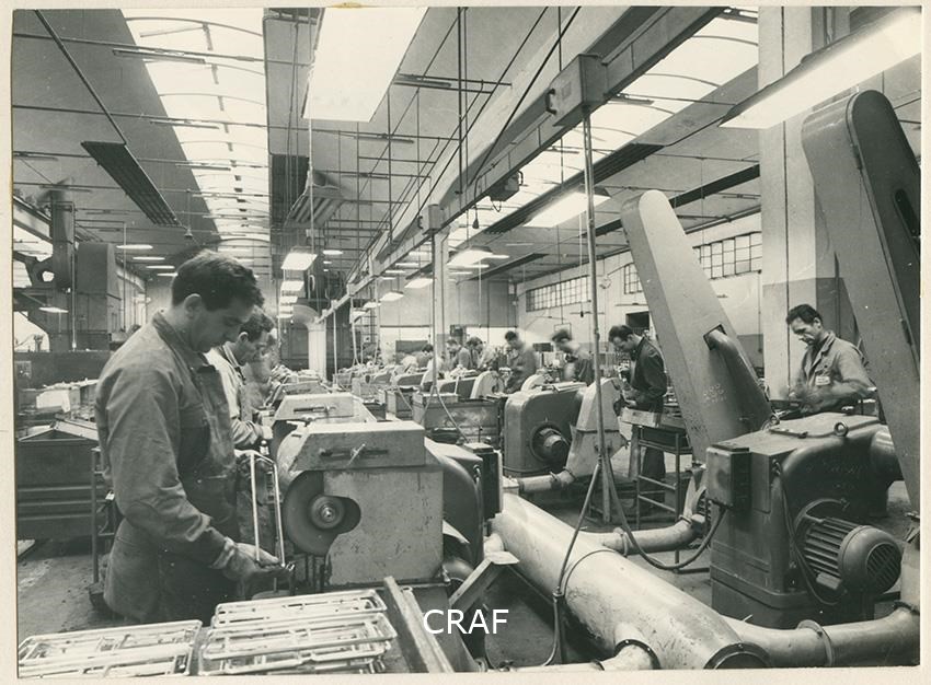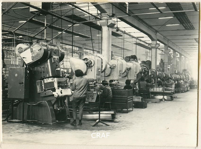 Stabilimento Zanussi: due operai operano una pressa verticale a iniezione