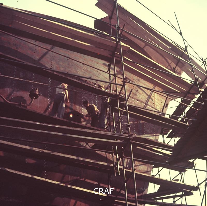 Due operai di un cantiere navale lavorano sui ponteggi.