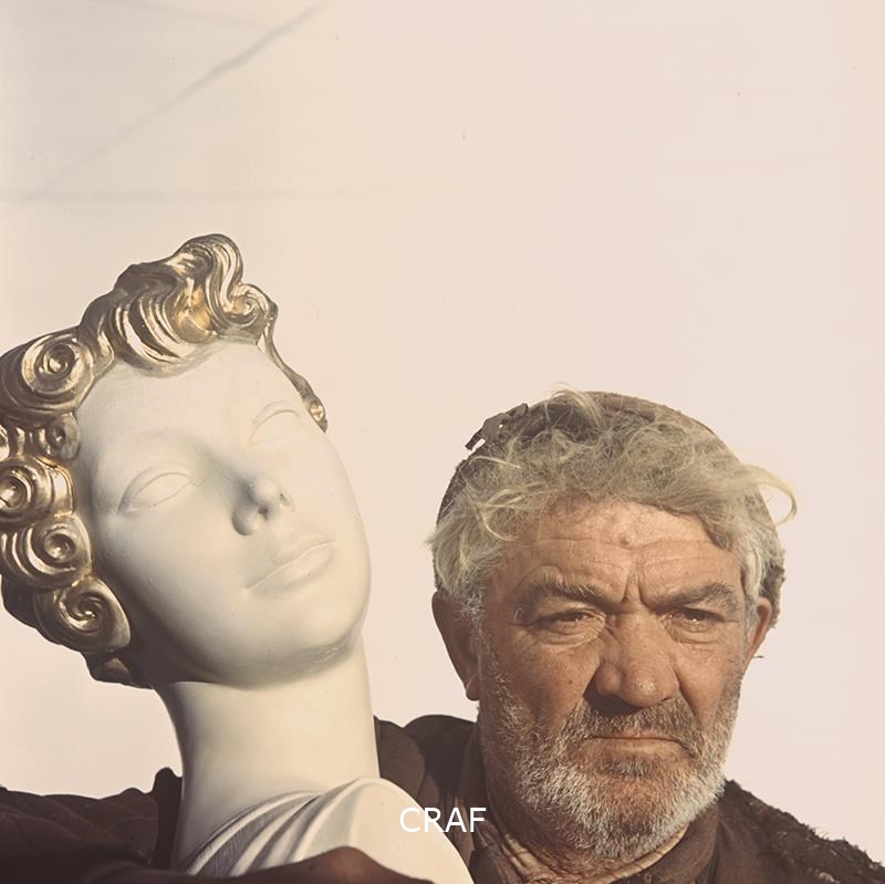 Primo piano di un uomo anziano che tiene fra le braccia una statua femminile.
