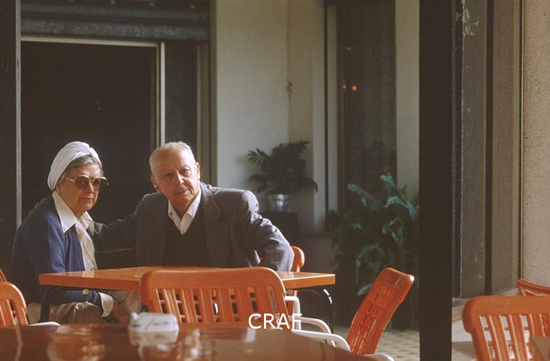 Ritratto di Carlo Bevilacqua seduto ad un tavolino di un bar con la moglie.