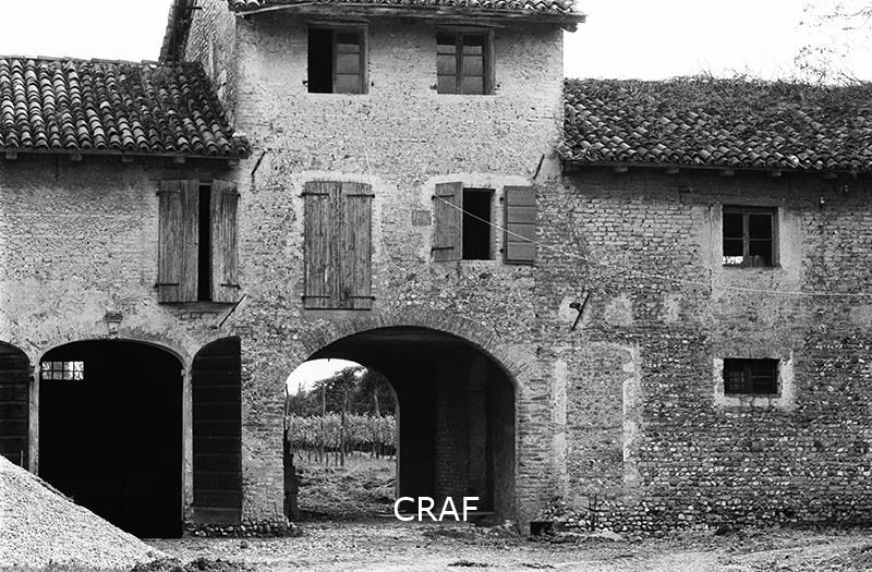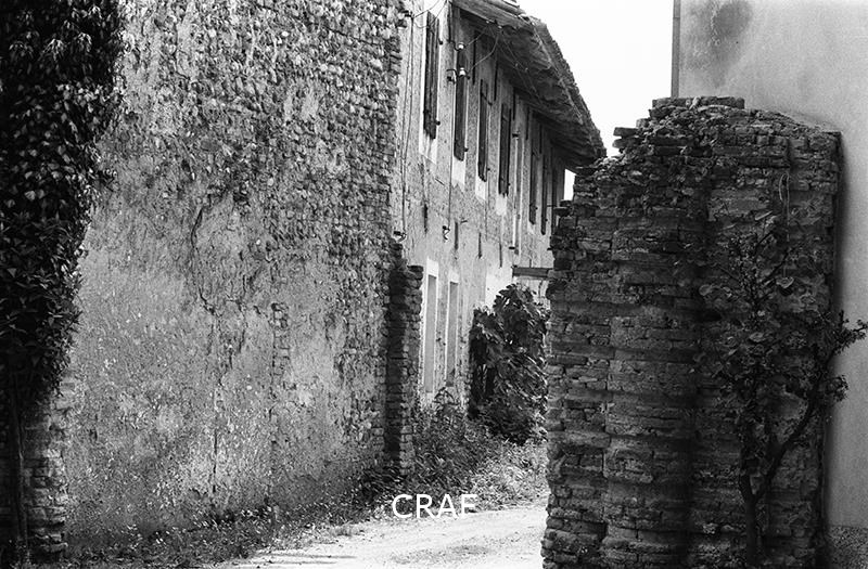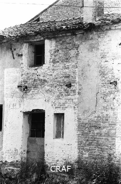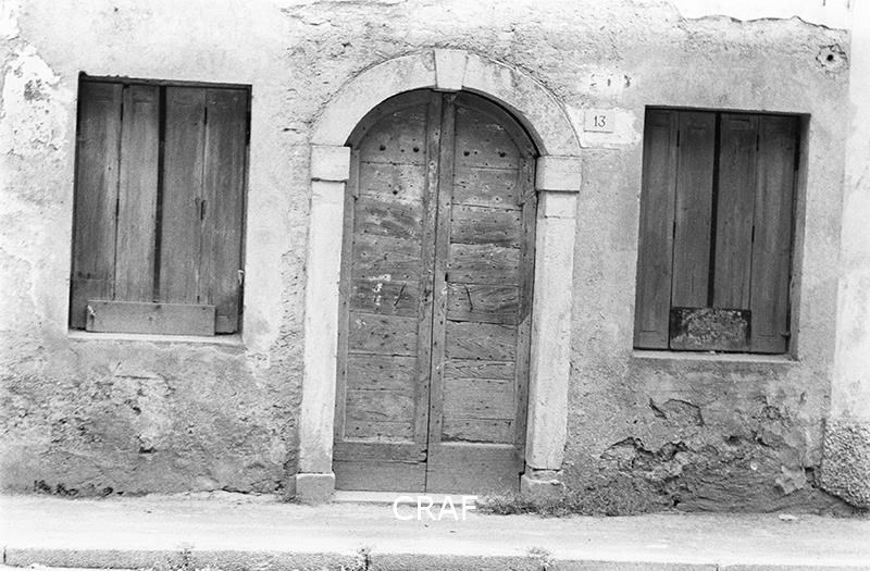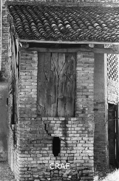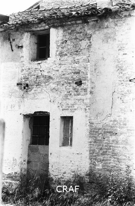 Scorcio della parte di una casa rurale, di un portone chiuso e di una piccola...
