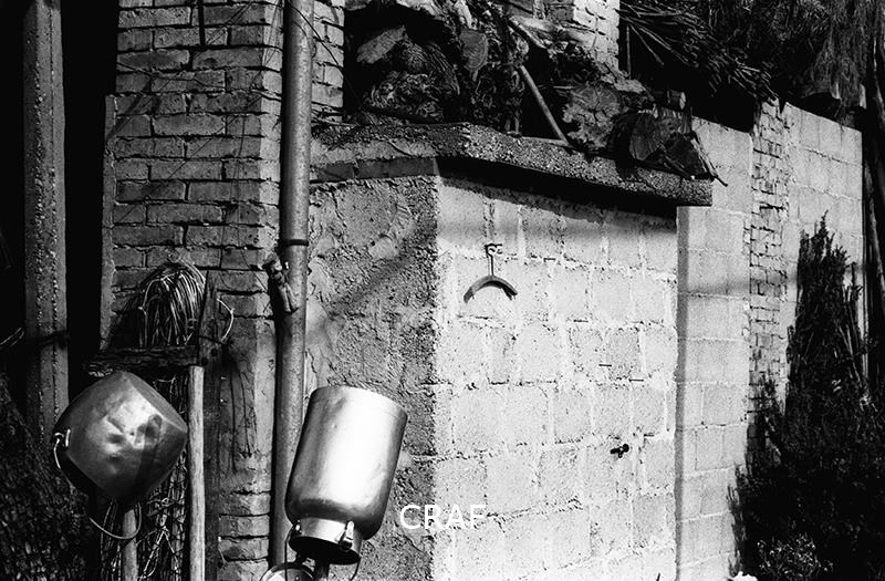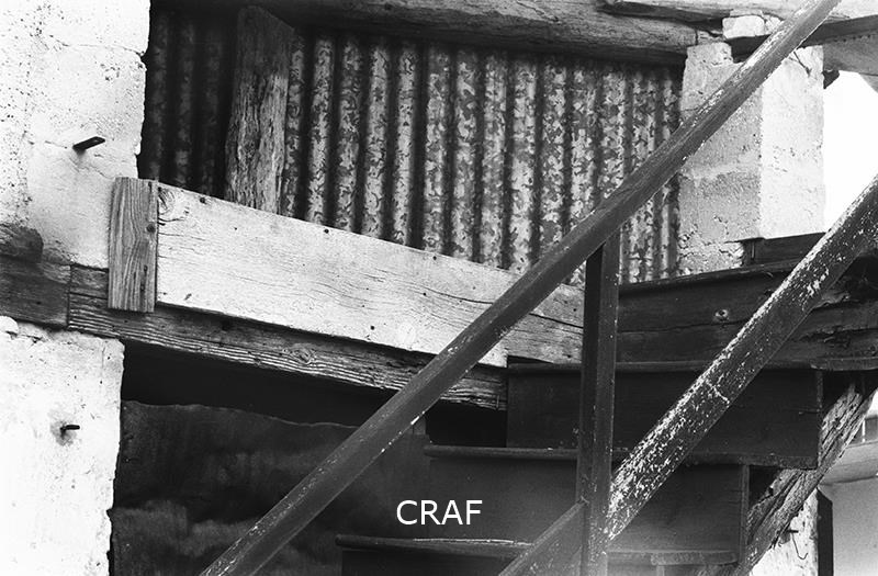 Scorcio di un ricovero, a sinistra dei vasi porta latte capovolti appesi a dei...