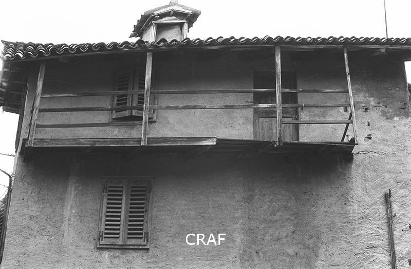 Scorcio della parte di una casa rurale, di un balcone chiuso e di una piccola...