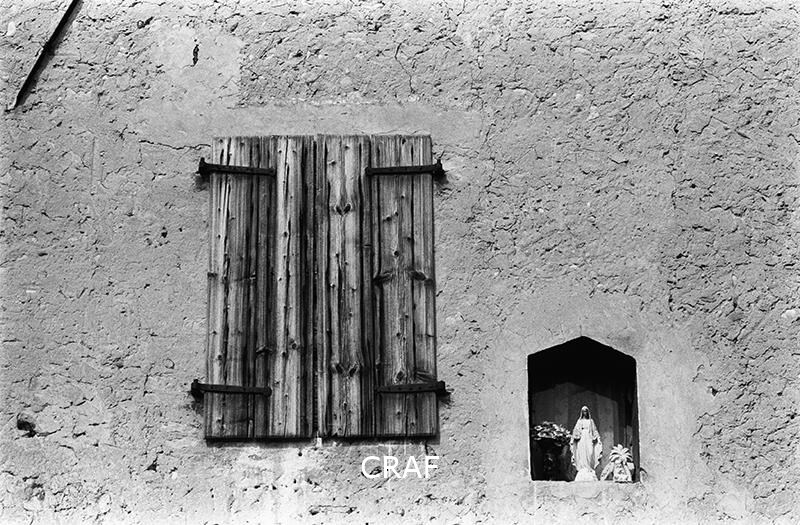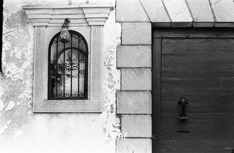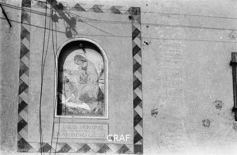 Scorcio della parte di una casa rurale e di una nicchia votiva con un affresco...