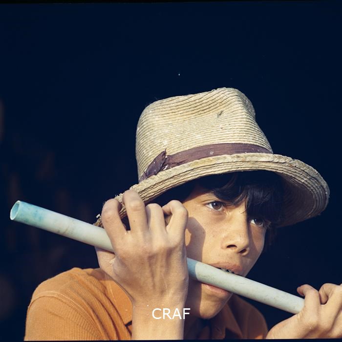 Ritratto in primo piano di un ragazzino con cappello di paglia in testa e un...