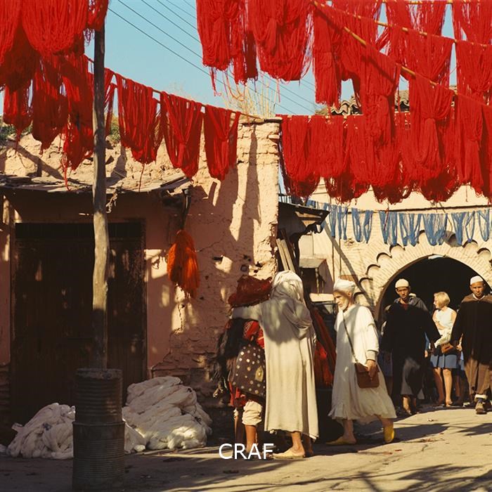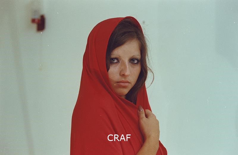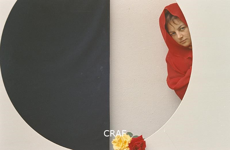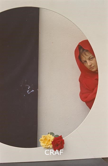 Rappresentazione: una donna con velo rosso in testa che spunta da un un foro...