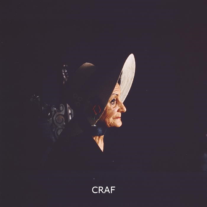 Ritratto di una donna anziana con cappello vistoso in un ambiente buio