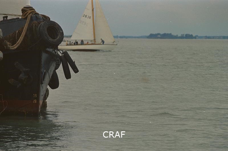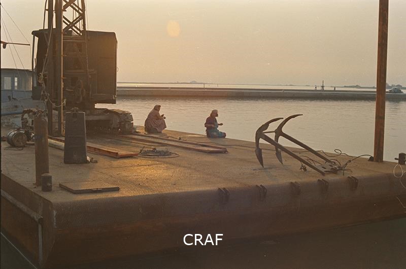 Veduta di una chiatta con una gru; due donne sedute sulla chiatta; sullo sfondo...