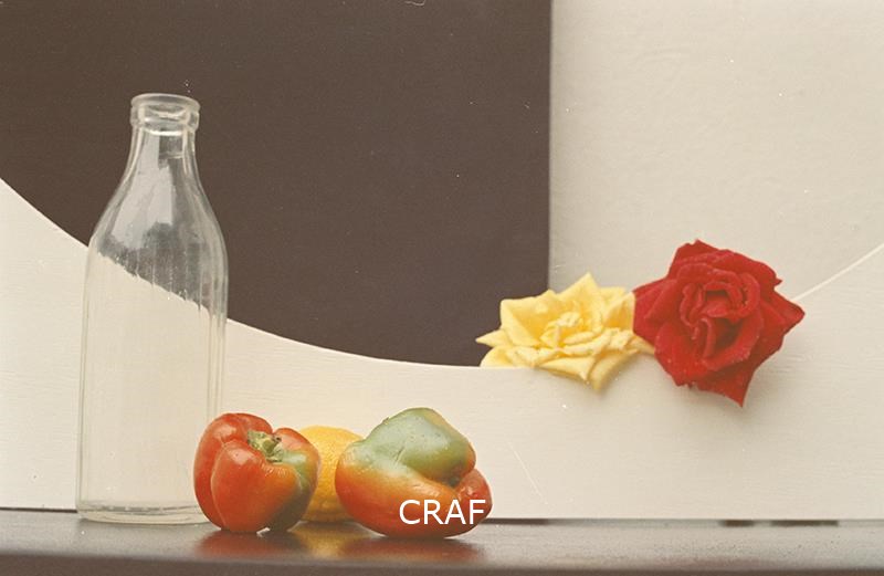 Natura morta: una bottiglia, due peperoni e due rose poggiate su un tavolo e...