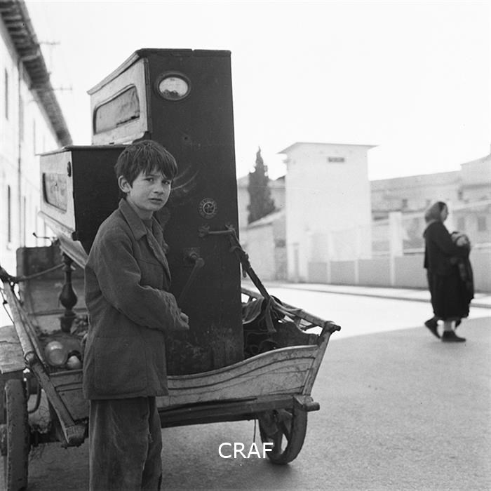 Nell'immagine un bambino che trasporta su di un carretto un organo di legno
