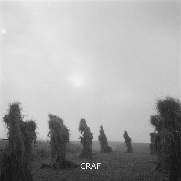 Veduta di alcuni piccoli covoni di fieno in un prato di campagna