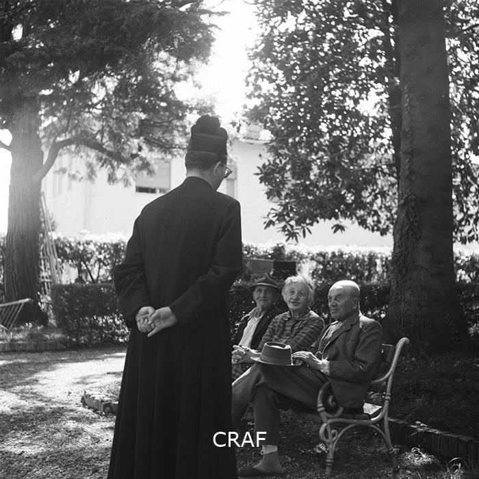 L'immagine ritrae un parroco di spalle mentre chiacchera con un gruppo di...