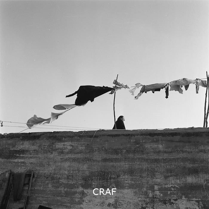 Ritratto di una donna sulla terrazza di un'edificio dove sono appesi dei panni...