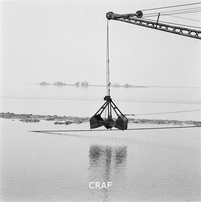 Veduta di una gru mentre scava tra i canali della laguna