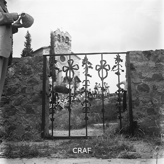 Veduta, attraverso un cancello, di un gruppo di persone in abiti tradizionali...