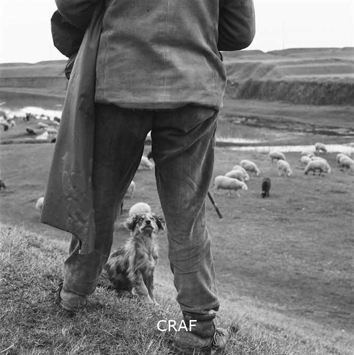 Un cucciolo di cane osserva il suo padrone di spalle: è il pastore del gregge...