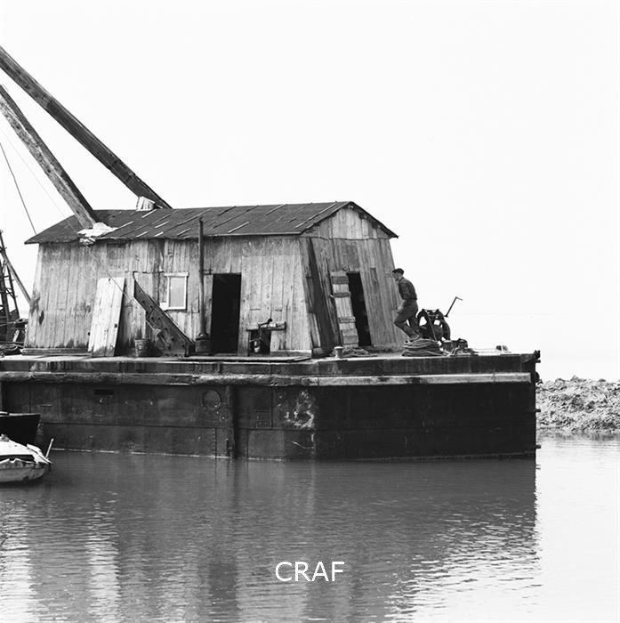 Veduta della base di una gru mentre scava tra i canali della laguna