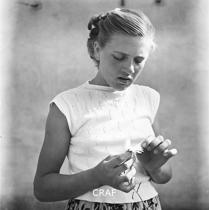 Ritratto di una ragazza mentre mentre toglie i petali di una margherita