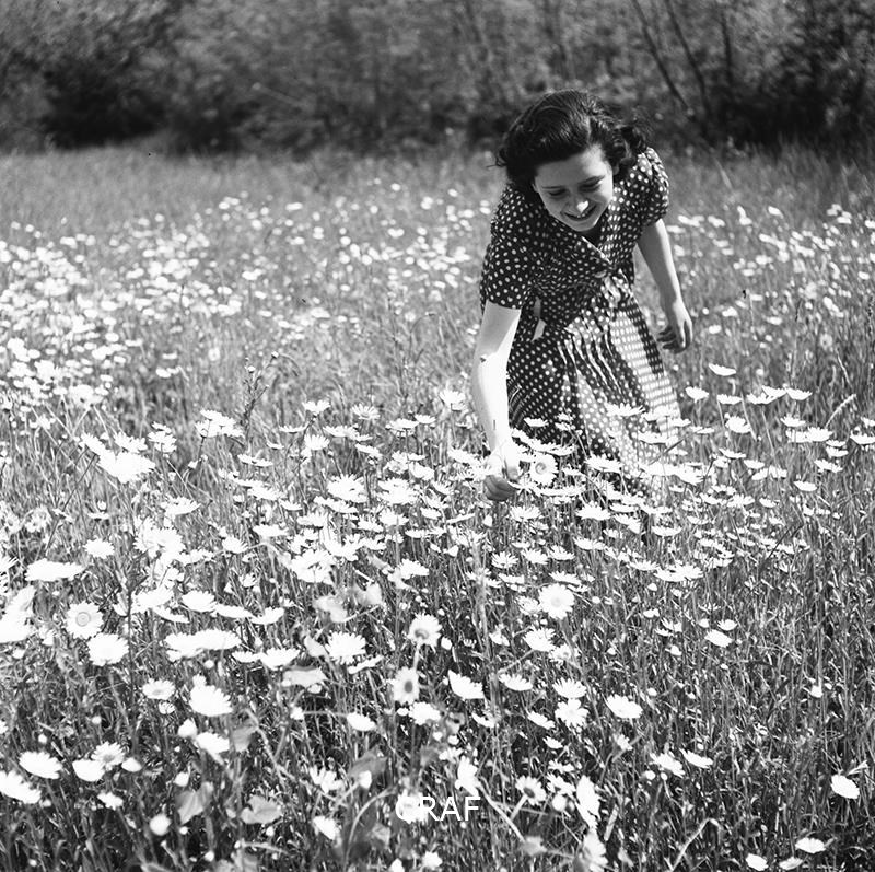 Ritratto di una ragazza mentre raccoglie delle margherite da un prato