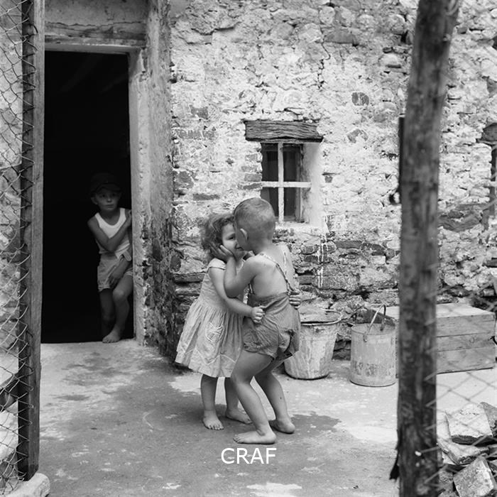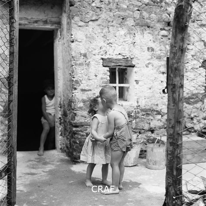 Due bambini mentre si scambiano un bacio nel cortile di una casa rurale