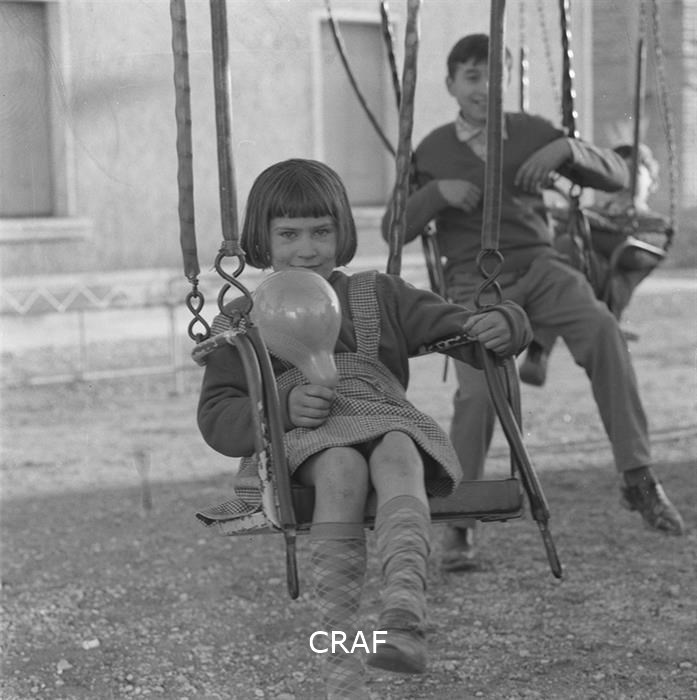 Ritratto di bambini mentre si dondolano sull'altalena; sono due immagini...