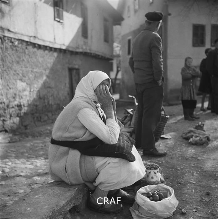 Ritratto di una donna anziana, seduta su di un muretto con dei sacchetti...