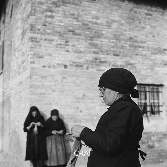 Ritratto di una donna anziana mentre, lavorando a mano con filo e uncinetto, ...