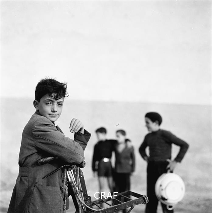 Ritratto di un ragazzino appoggiato al manubrio di una bicicletta, sullo sfondo...