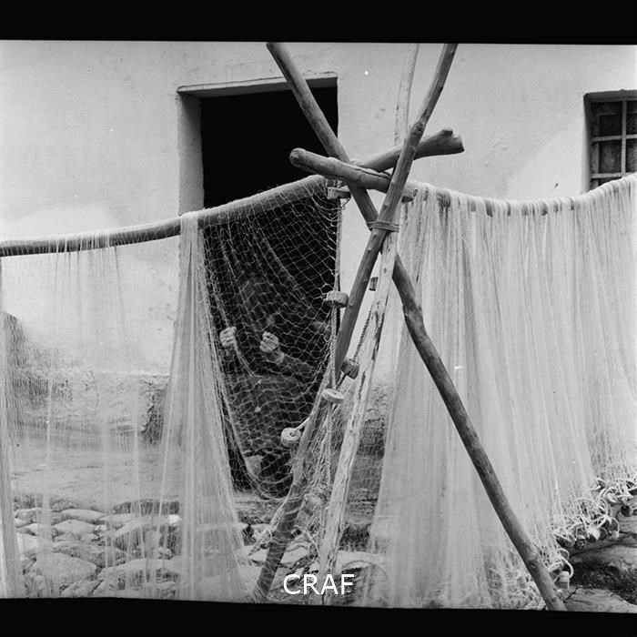 Delle reti da pesca messe a stendere; un uomo, probabilmente il pescatore, le...