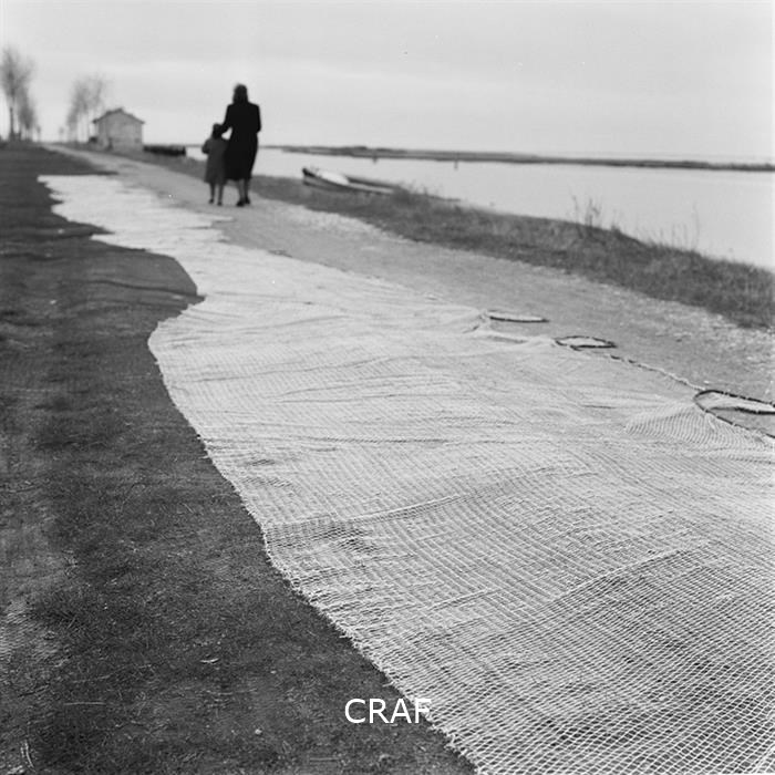 Veduta di alcune reti da pesca stese a terra; sullo sfondo una madre con il...