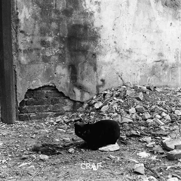 Ritratto di un gatto nero accovacciato fra dei calcinacci