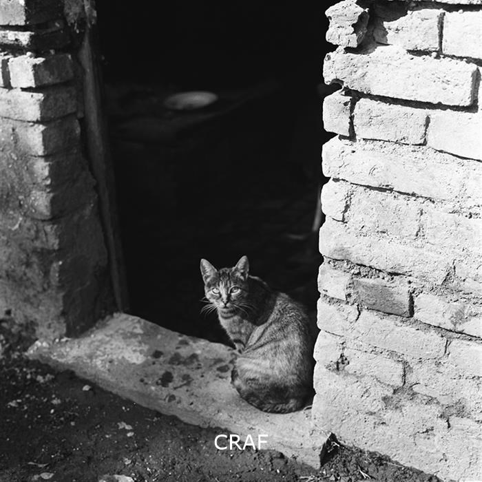 Ritratto di un gatto tigrato sull'uscio di una casa rurale