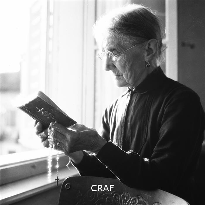 Ritratto di una donna anziana in preghiera: tiene in mano un libro di preghiere...