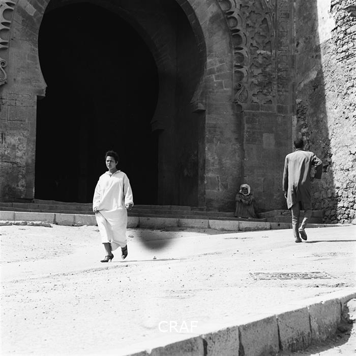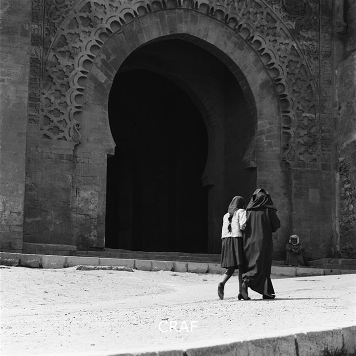 Due donne mentre camminano accanto al portone d'entrata di una moschea